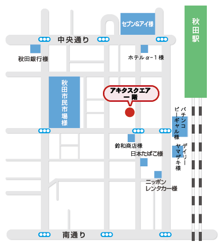 - JR秋田駅より徒歩5分。中央通りを大町方向に進み、ホテルα-1(アルファワン)様を過ぎたら左に曲がって下さい。
